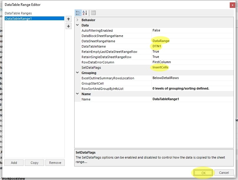 - Set the SetDataFlags to “InsertCells”. This will expand our DataRange as rows are added in the View.