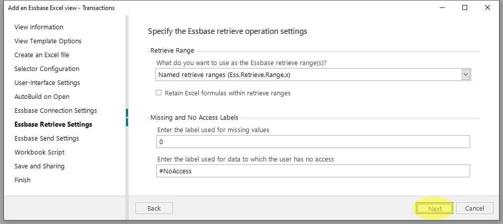 - We will not be sending Essbase data in this view so these settings are not relevant. Press “Next” to continue.