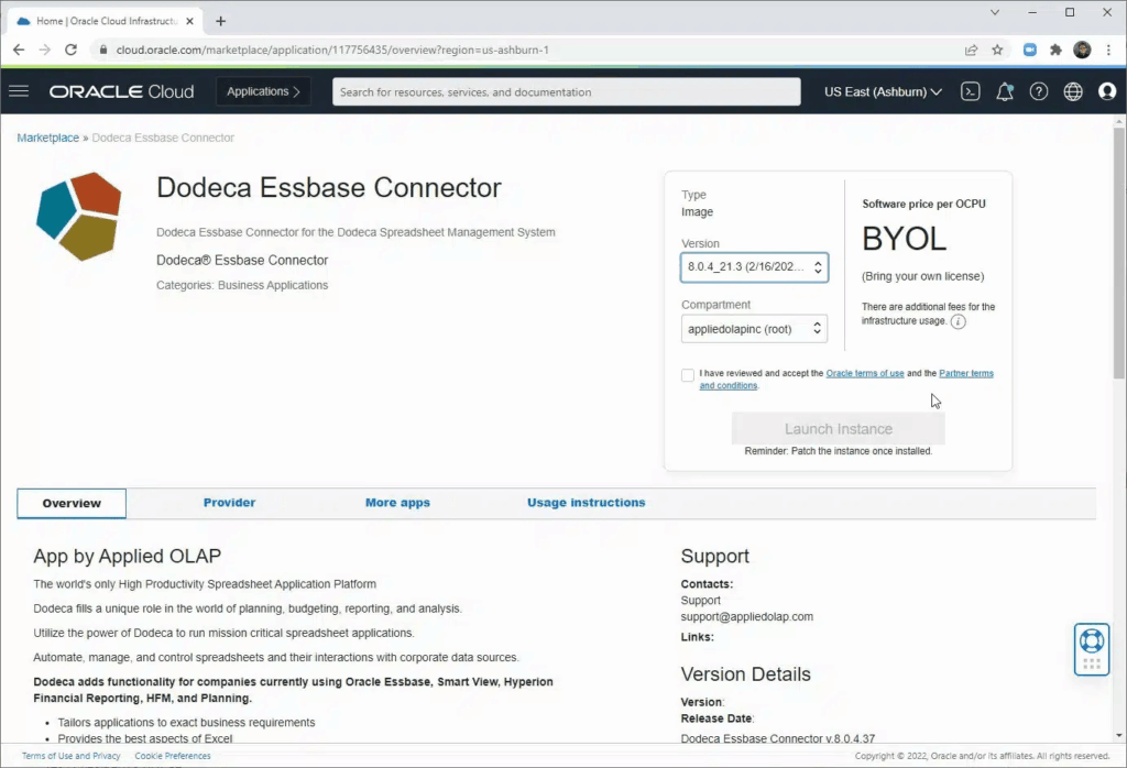 This component uses the Bring Your Own License model, but the good news is that if you have a Dodeca license, you already have the license you need for the Dodeca Essbase Connector. Note that you will have to pay Oracle for use of the cloud server, but the pricing for OCI compute images on which this is based is very reasonable. You will also need to consider how many CPUs you want to deploy, but you can easily change the shape of the instance if you find you need more (or fewer) CPUs.